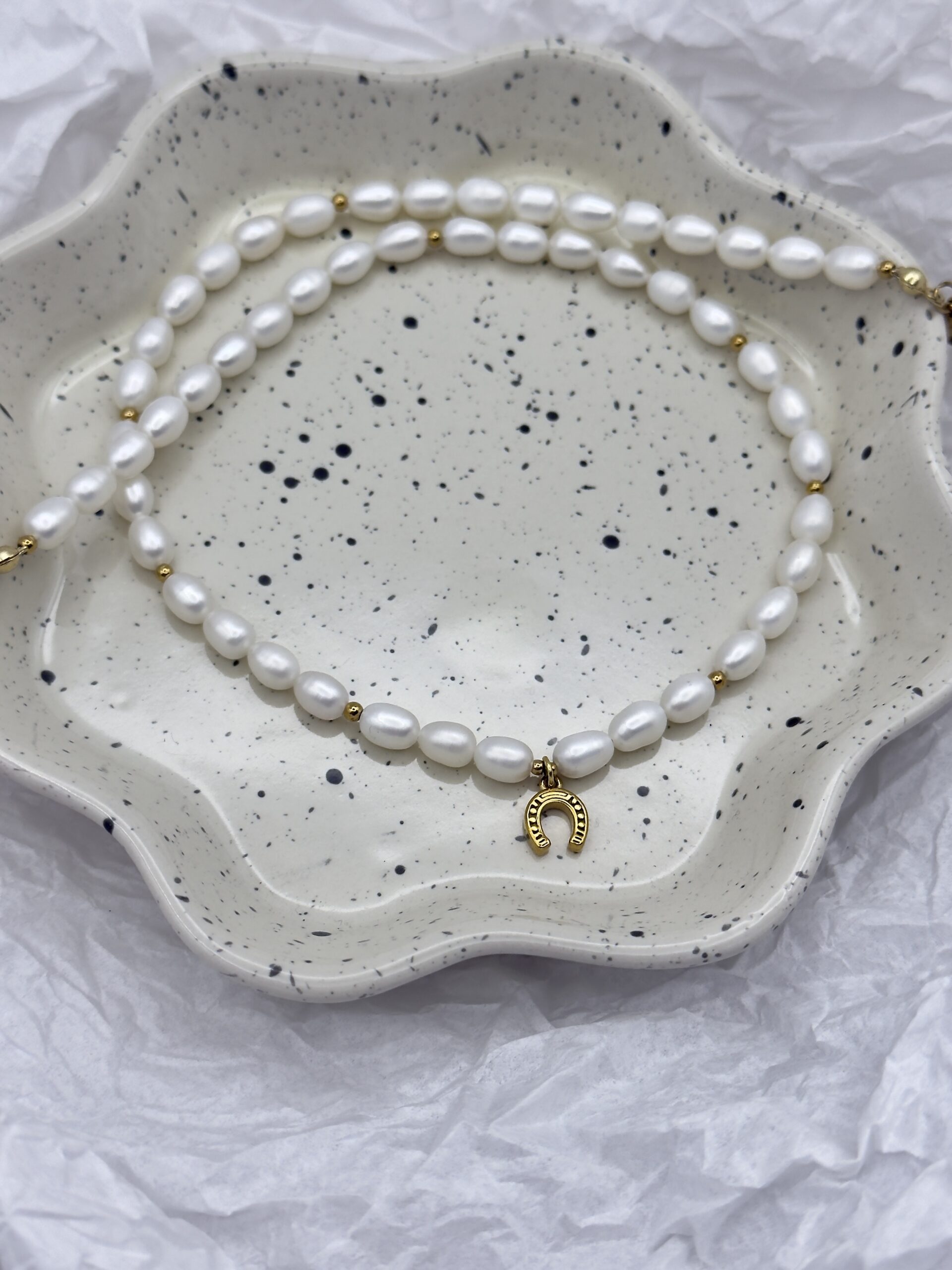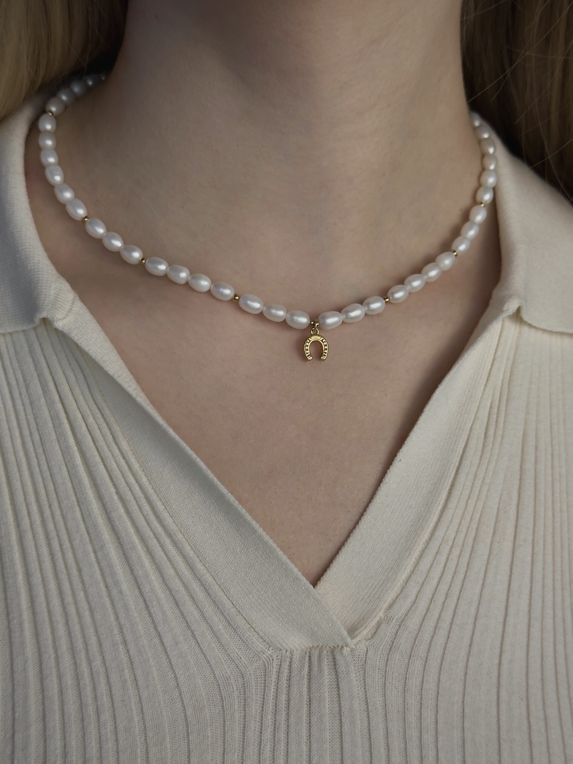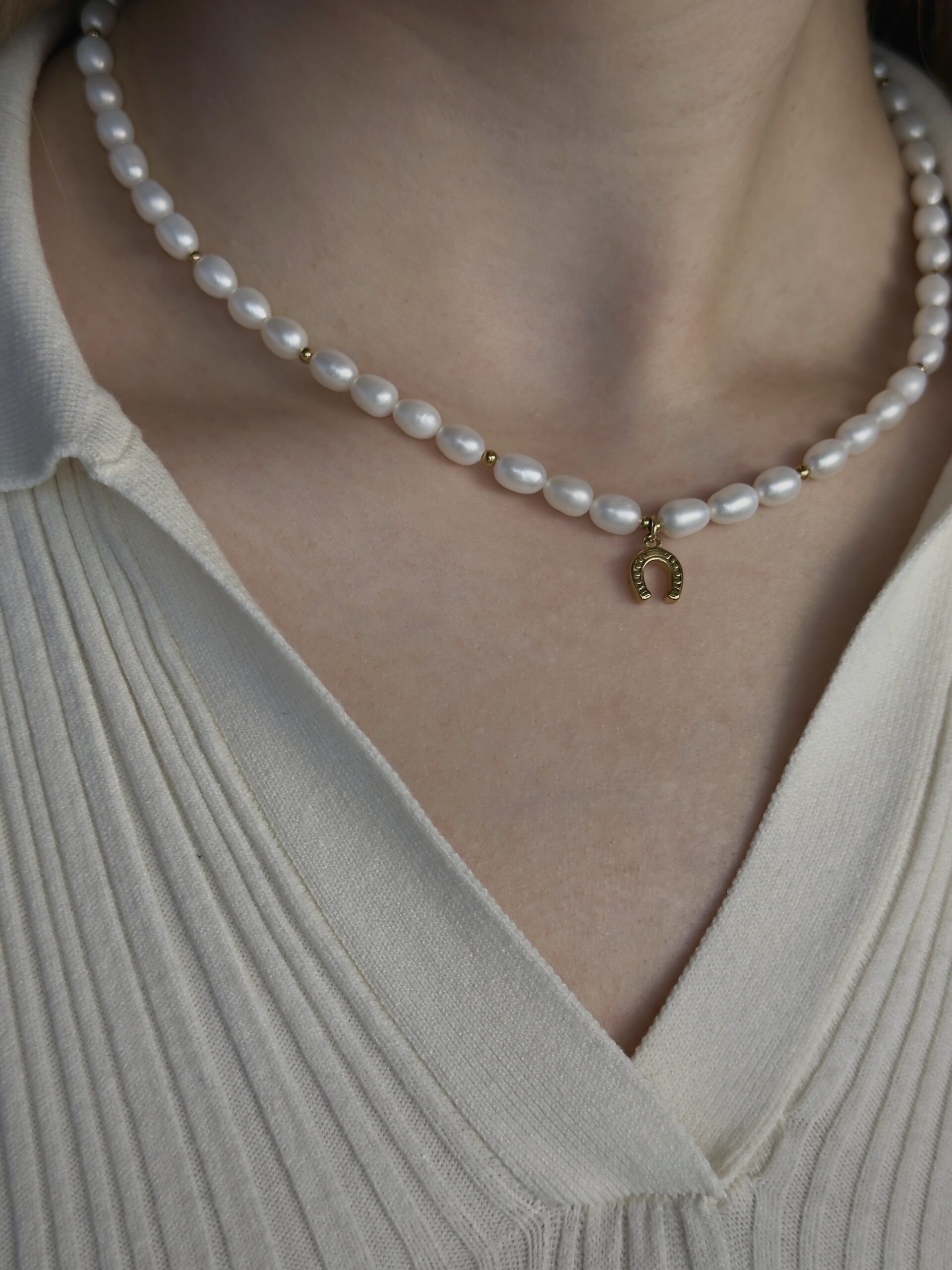 Subtilus perlų vėrinys, išsiskiriantis švelniu natūraliu spindesiu. Kompoziciją papildo aukso spalvos pasagos formos pakabukas, suteikiantis papuošalui lengvumo ir išskirtinio akcento.