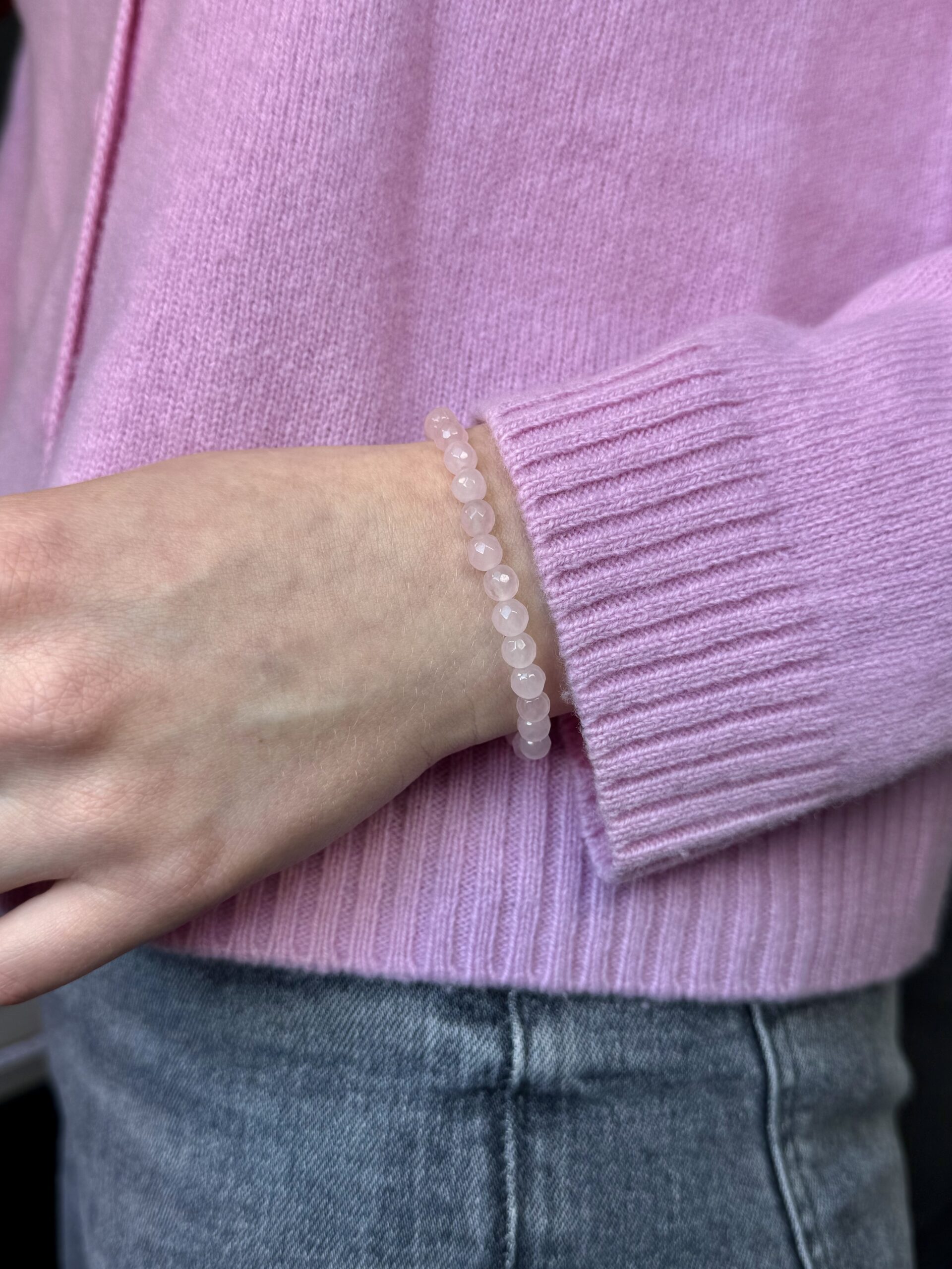 Švelni rožinio kvarco apyrankė, suverta iš briaunuotų akmenukų, kurie subtiliai atspindi šviesą. Elastinga gumytė užtikrina patogų nešiojimą.