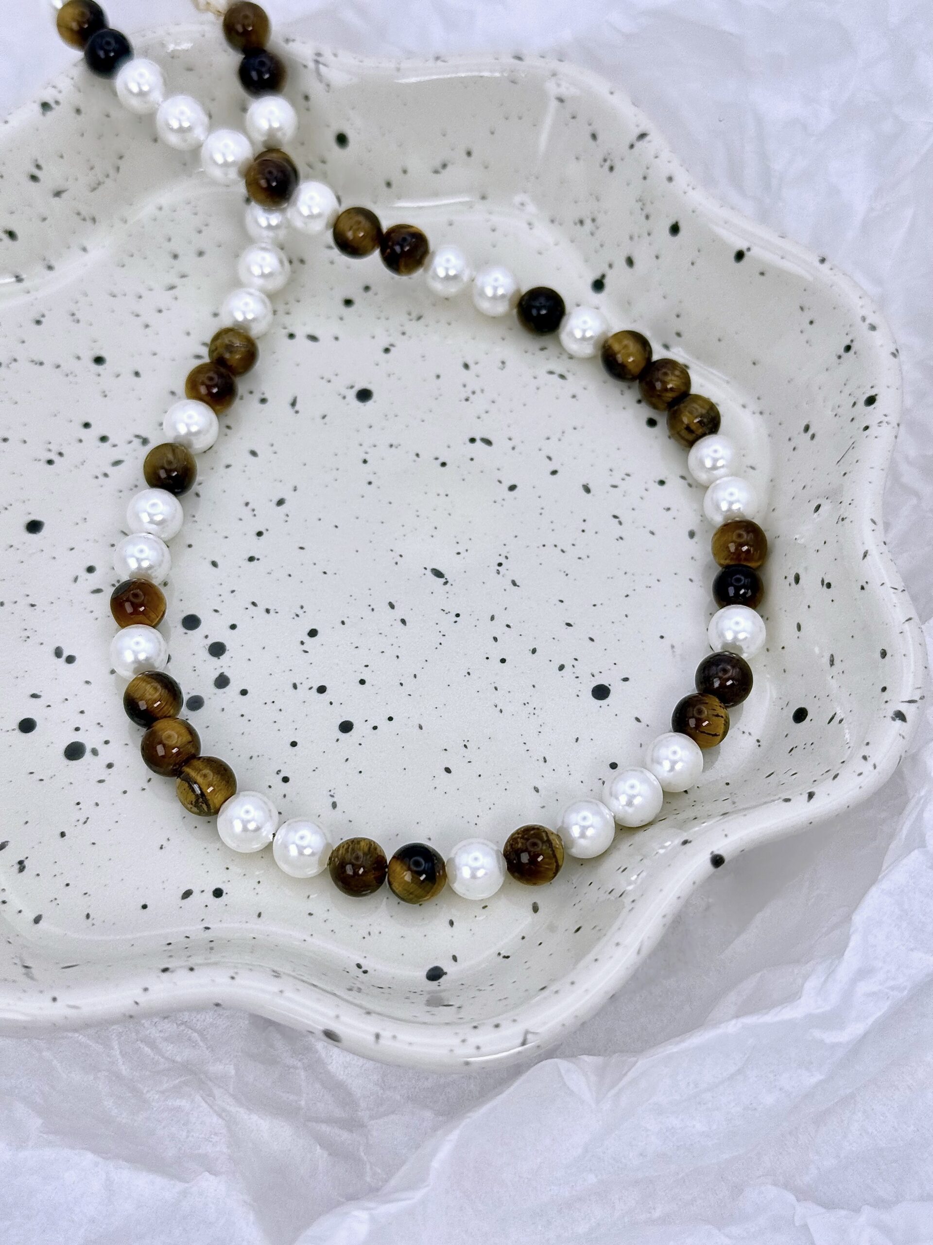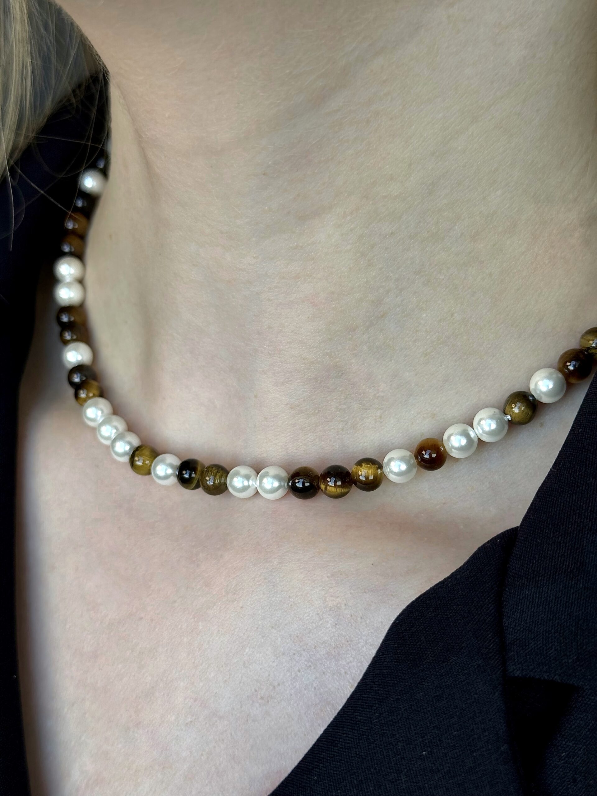 Tigro akies ir perlo masės vėrinys, natūralus raštas ir švelnus blizgesys kuria akį traukiantį derinį. Šilti tonai atsiskleidžia kiekviename akmenuke ir suteikia papuošalui jaukumo bei elegancijos.