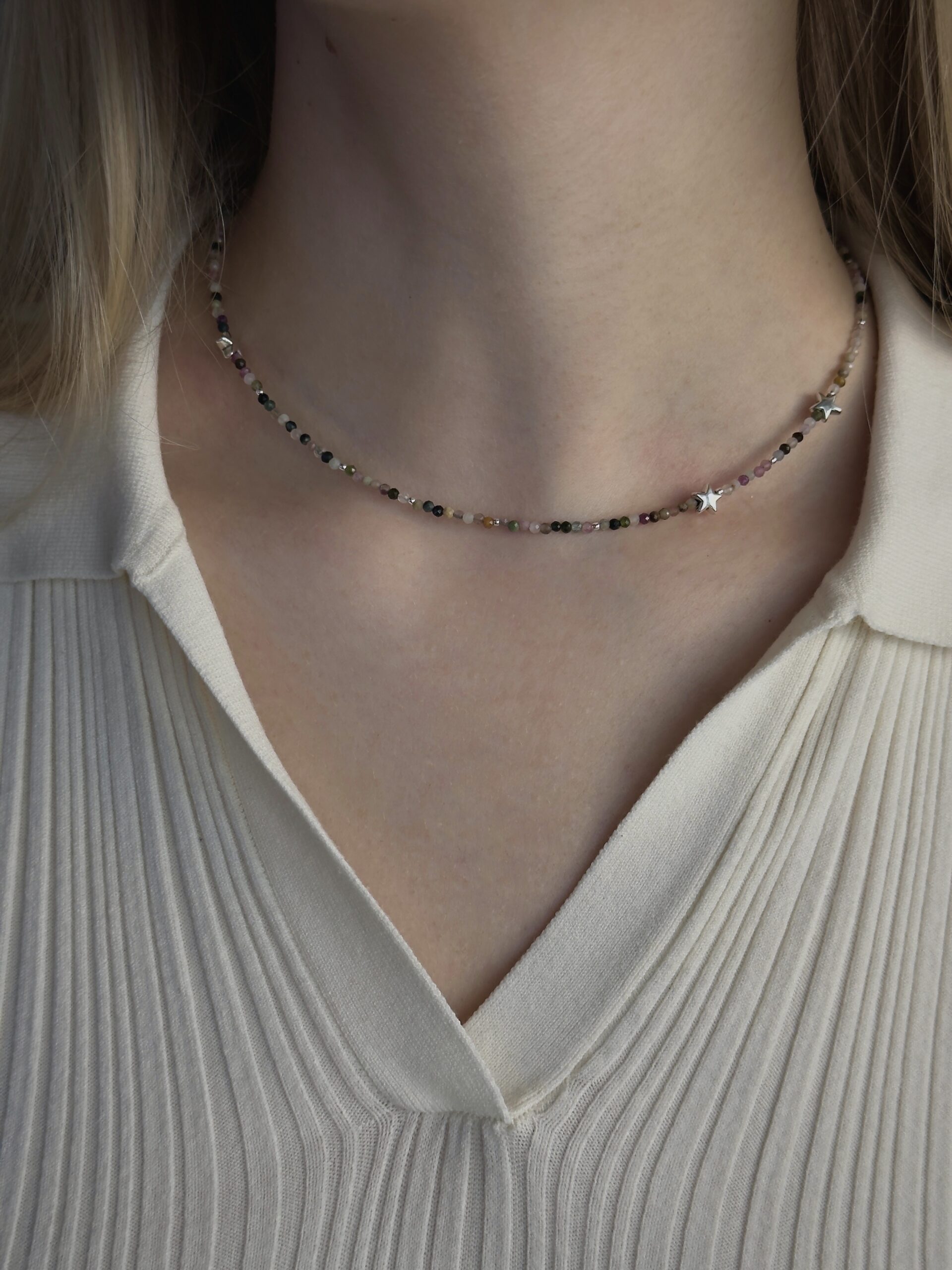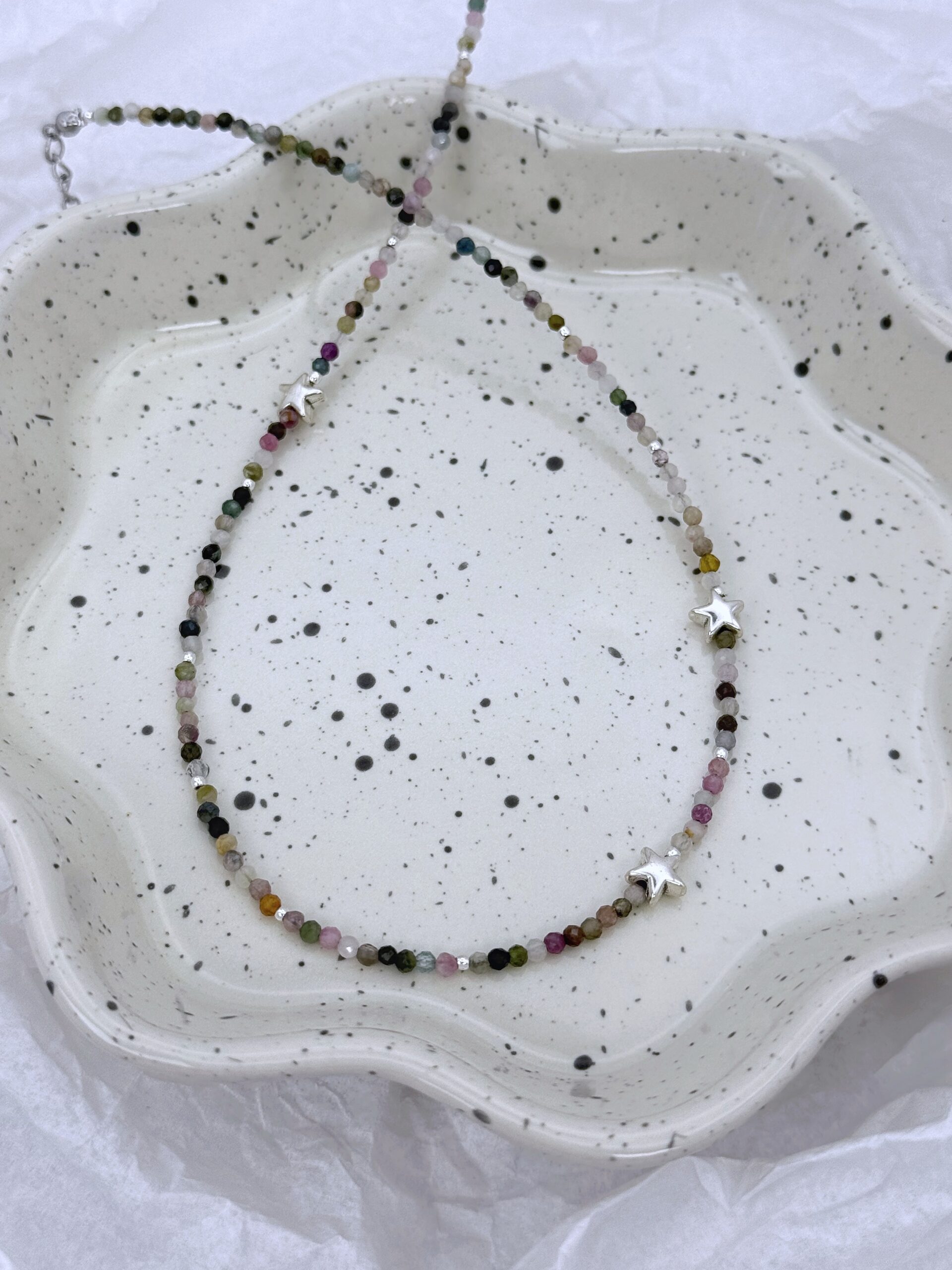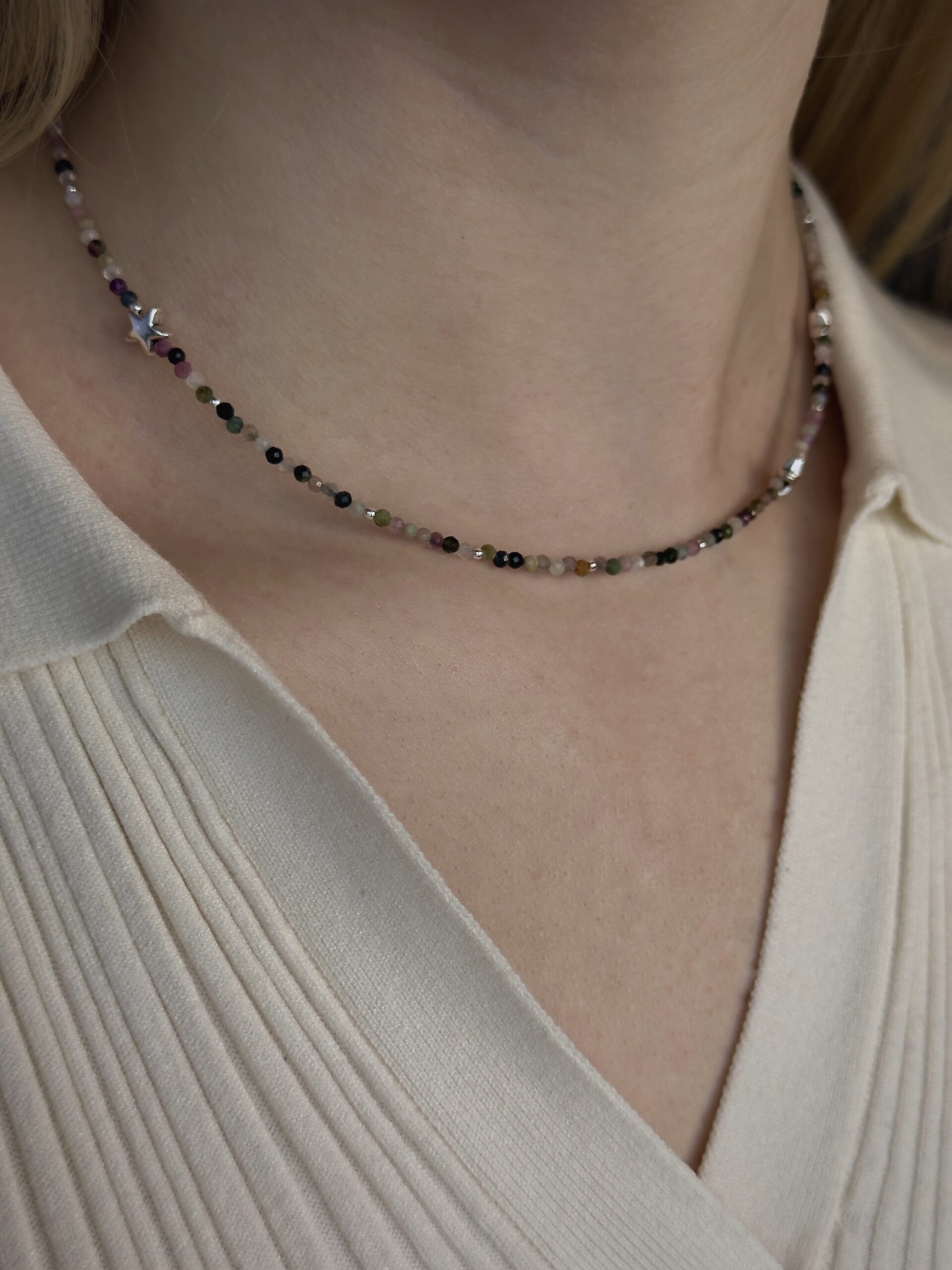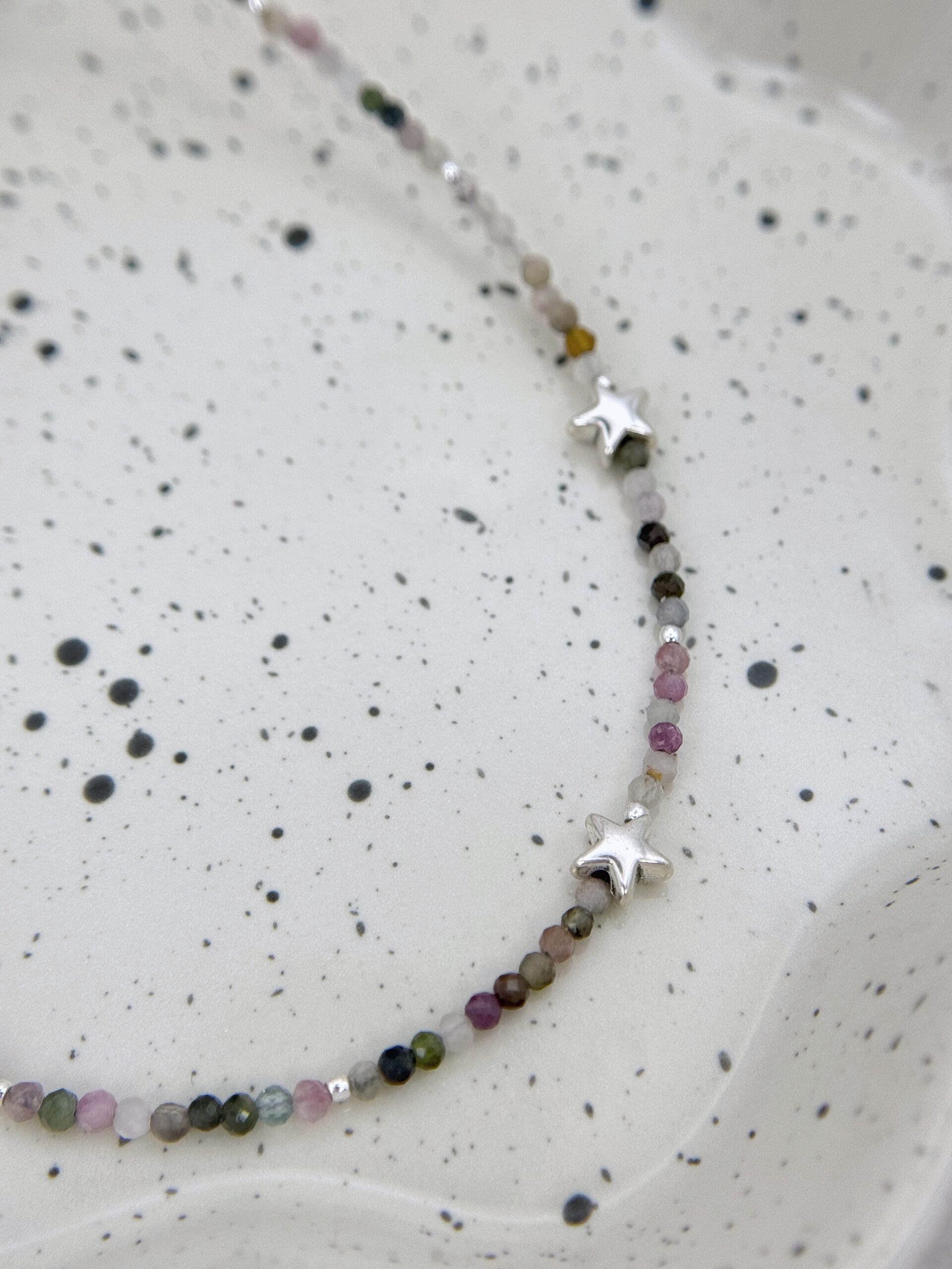Spalvingas turmalino vėrinys, papildytas hematito detalėmis ir žaismingomis žvaigždutėmis.