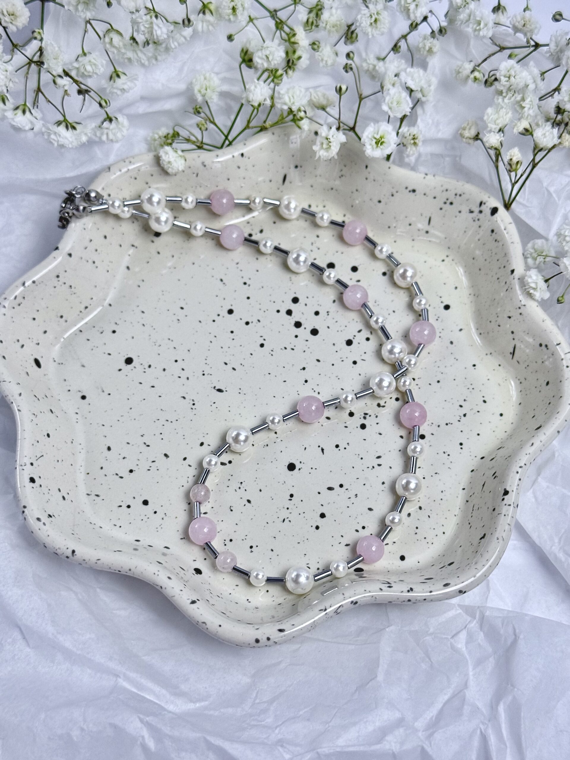 Vėrinys sukurtas iš rožinio kvarco, hematito ir perlų masės.